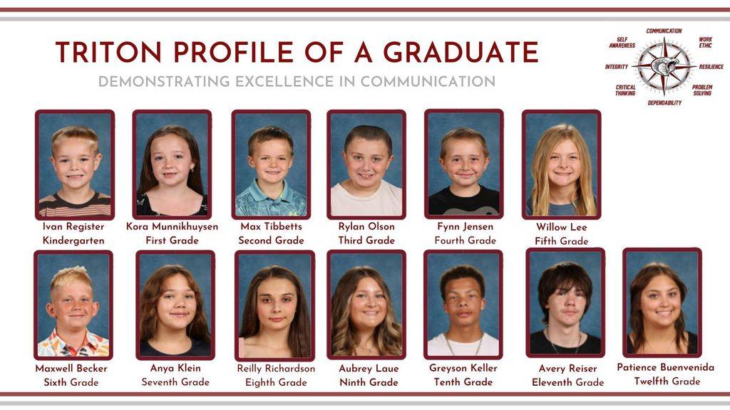 Congratulations to the latest Profile of a Graduate Award Winners! Our Triton teachers have selected one student per grade level to receive this honor. These students continue to be leaders and role models. They have excelled in the profile area of Communication.